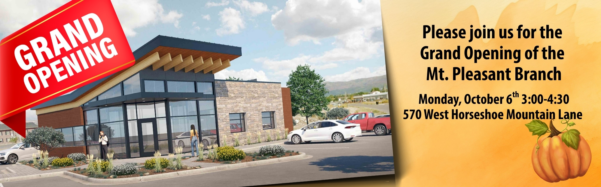 Please join us for the Grand Opening of the Mt. Pleasant Branch Monday, October 6th 3:00-4:30 p.m. 570 West Horseshoe Mountain Lane Drawing for prizes including e-bike and Blackstone grills Fall refreshments Halloween backpacks with prizes for the first 100 kids.
